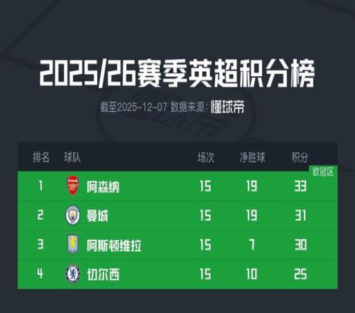 阿斯顿维拉目前则是以30分位居积分榜第三名,距离阿森纳也只有3分的差距,比曼城少一分,而切尔西在与伯恩茅斯战平后积25分,比维拉少5分。